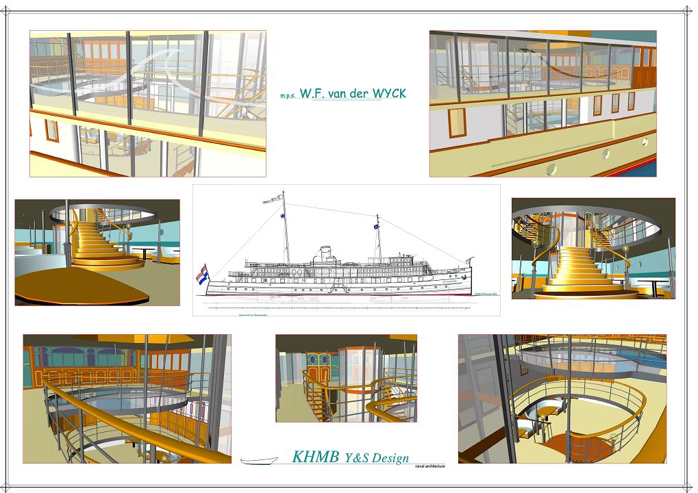 After some successfull digging in the archive of the Rotterdam Maritime museum for conserved documentations we made a preiminary design with respect to the original aesthetics. We suggested an 8 metre high Atrium with a 'glass bridge' and a design elevator for a 'rich' entrance as well as an 'English pub' and a 'Wheelhouse bar'. Large, in size adaptable conference/exhibition-rooms, are situated under deck and on the first tier in the foreship. New main engines were planned to replace the old ones and furthermore the crew accommodation and provisions are located underdeck in the aft-ship. The comfortable and spacies galley is planned to be on the first tier aft of the midship. To visualise the different accommodations a 3D interior lay-out was made of the midship part. .