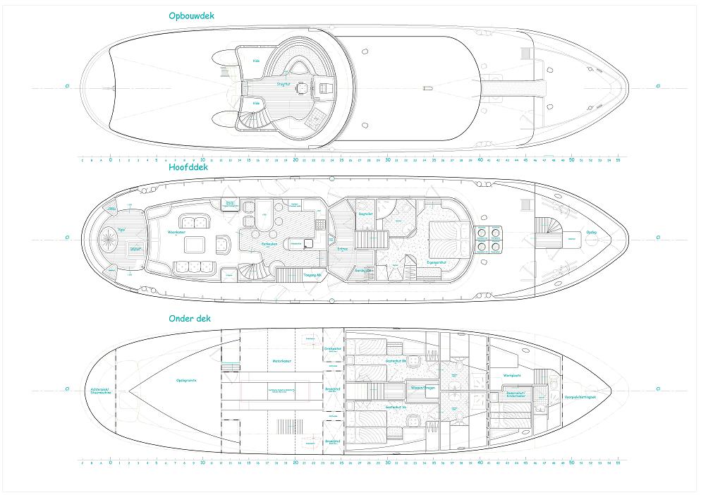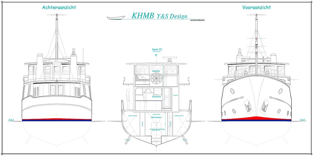 This design represents a plan for a conversion of a former fishing cutter into a classic yacht for leisure. The old steel roundhouses will be replaced by an aluminium one to reduce weight and increase stability figures. This new roundhouse will give room to a living area incl. an large open galley as also the owner state room which is situated is the forward part. Under deck a large engine room is situated and in front of that a couple of Guest cabins, In the foreship a spare cabin. The elliptical wheelhouse is 'coupled' to the living area due a vide, to ensure a real 'integrated' interior. Overall the ship will keep her original sturdy appearance completed with yachty accents.