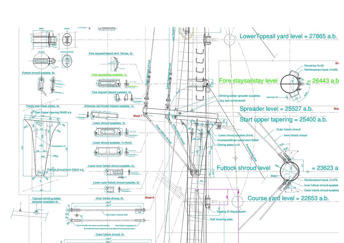 - Rigging drawings and -calculations for custom built masts, bowsprit, booms, gaffs and yards.